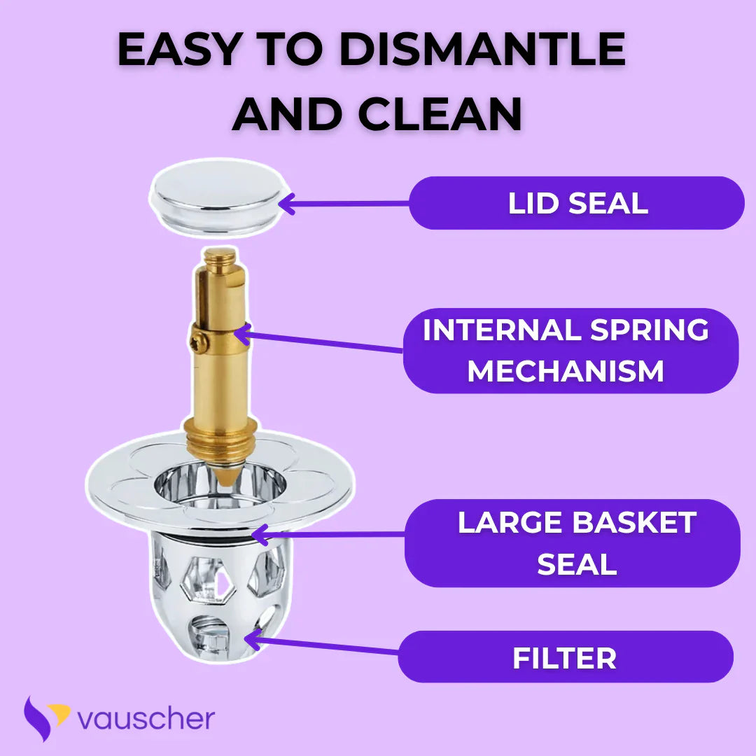 Unpleasant odours coming from your drain? Ever lost a valuable piece of jewellery down the sink? Avoid these problems with the Vauscher Pop-Up Drain Stopper!